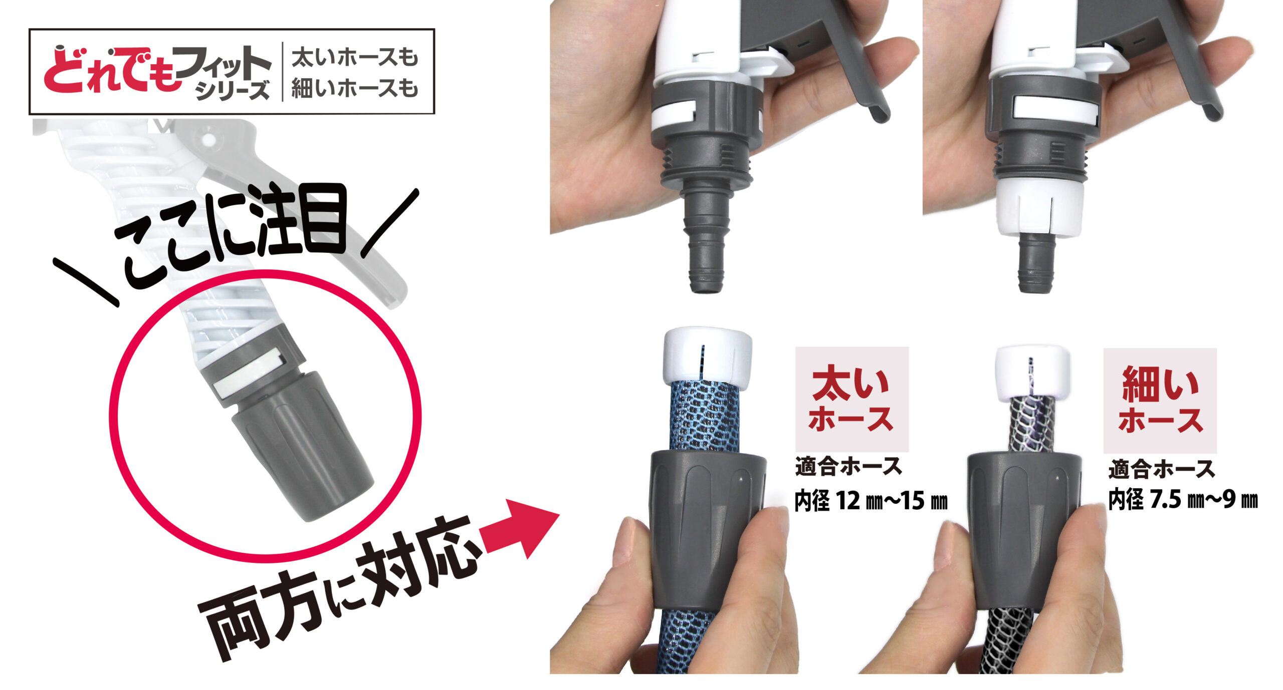 太いホースも、細いホースも、どれでもフィット