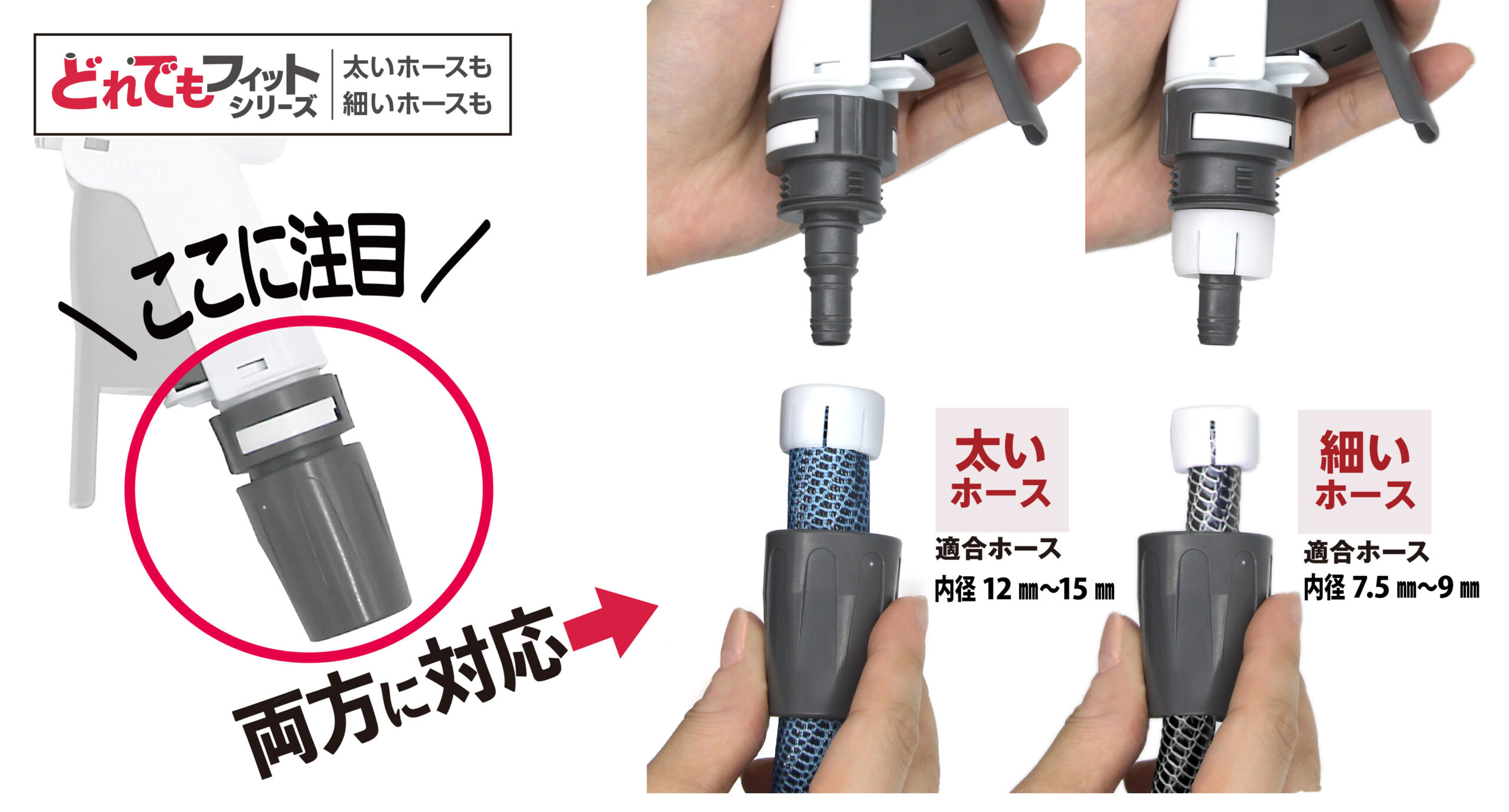 太いホースも、細いホースも、どれでもフィット